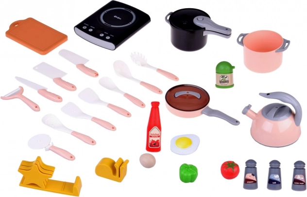 Our kids' kitchen set is a great way to encourage your children's culinary creativity. Made from safe plastic, it contains all the essentials for kids' cooking, including a single-burner cooker, pots, food items, and kitchen tools.