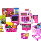 This set includes a cash register, calculator, barcode scanner, microphone, baskets, shopping trolley, and various play money, providing children with a realistic and comprehensive play experience.