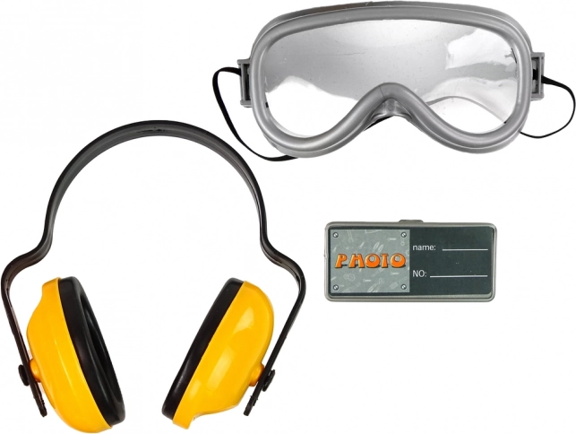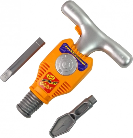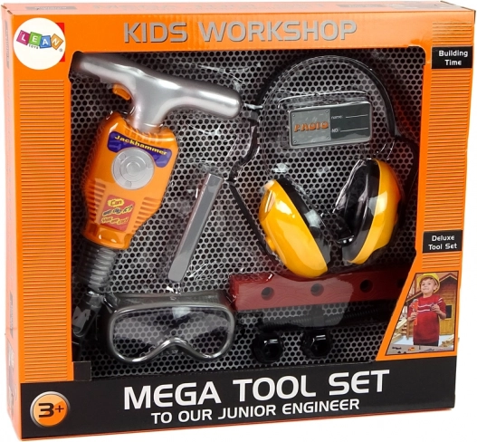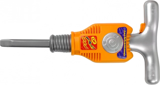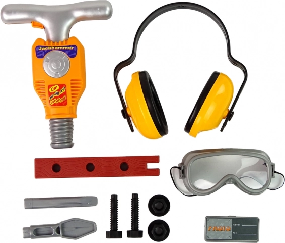 The set includes screws that can be fastened with the jackhammer, which operates characteristically when the orange button on the handle is pressed (batteries required). Safety gear, including goggles and headphones, adds to the fun and ensures safety during play.