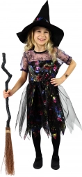 We have a stunning carnival costume that will make your girl a star of the carnival and Halloween! The costume comes in a striking black and purple color combination and is adorned with colorful Halloween motifs. A beautifully coordinated witch hat is part of the costume.