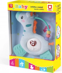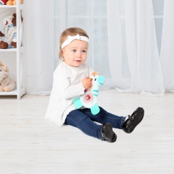 It is equipped with AG13 batteries, which are included in the package, so it is ready to use immediately. A practical clip allows easy attachment to a stroller, ensuring that the toy is always at hand.