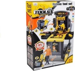 Included are realistic child-friendly tools: saw, wrenches, screwdrivers, adjustable wrenches, hammer, pliers, boards, screws, nuts, and additional accessories. Everything is made from high-quality plastic for safe play and long-lasting durability. The set comes in a gift box and, thanks to CE certification, is a great choice as a present.