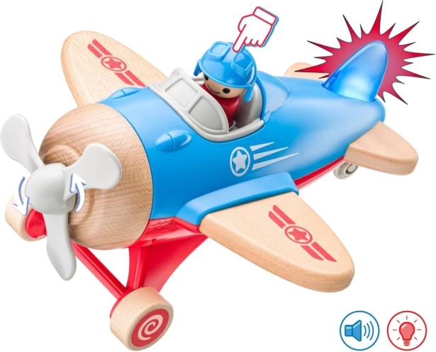 The plane is equipped with a turning propeller and a small pilot figure, encouraging interactive play.