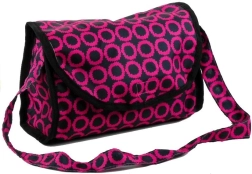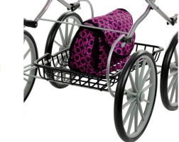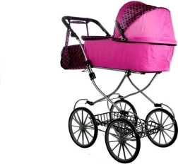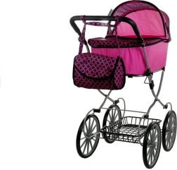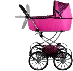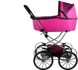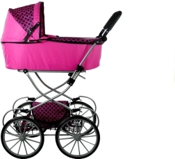 Stylish retro doll pram Alice in pink‑black with a circles pattern will delight every little mum. It offers a deep carrycot, an adjustable handle (53–82 cm), a lightweight and stable construction made of aluminium, and large wheels for easy handling. Includes a practical bag and a lower basket for accessories. Suitable for dolls up to 69 cm.