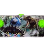 Discover the classic water game in a modern look with a stegosaurus. The rectangular body sits comfortably in your hand, and the transparent water tank holds colorful rings and two target pegs. Pressing the green buttons creates a water jet that lifts the rings upward. Your goal is to aim precisely and hook the rings onto the pegs.