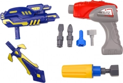 The set includes a kid-friendly drill and screwdriver designed for small hands, plus three interchangeable attachments. After assembly, the battery module from the drill can be used as the drive so the robot moves forward or backward. Play is elevated by light and sound effects and themed accessories — a sword and a dark blue blaster — for exciting missions and stories.