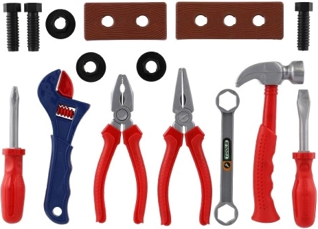 Hammer, screwdriver, pliers, wrench, nuts and bolts (contents may vary)