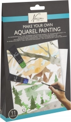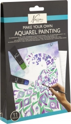 Includes 11 pieces: various acrylic paints, brushes, pre-drawn canvas, and a guide that takes you step-by-step through the painting process.
