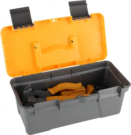 A fun and safe children’s tool set in a practical plastic carry case will delight all little fixers. It includes realistic plastic tools in bright colors, ideal for pretend play as a craftsperson, practicing fine motor skills, and fostering imagination. The compact size makes it easy to carry and store.