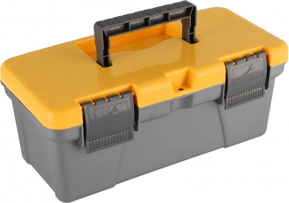 A durable plastic case with handle and latches keeps all parts together and is easy to carry.