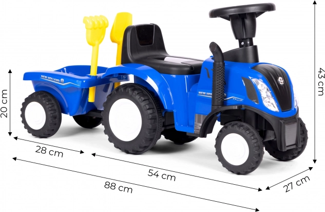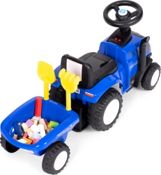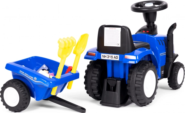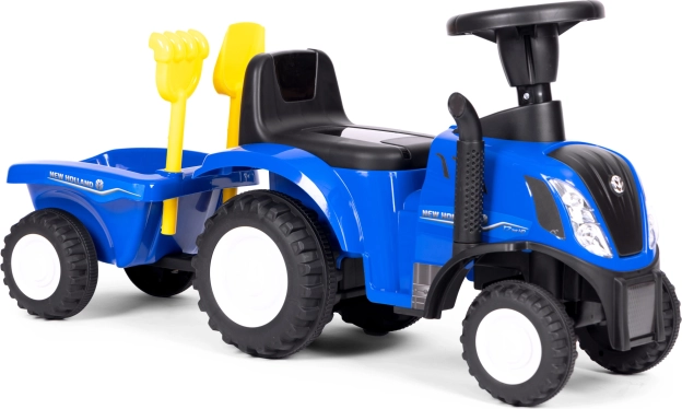 The blue ride-on tractor with a realistic look and official NEW HOLLAND license brings children hours of active fun indoors and outdoors. Robust plastic construction with metal elements ensures long service life and stable riding, while the trailer expands play options for transporting garden or sandbox treasures.
