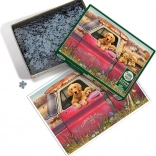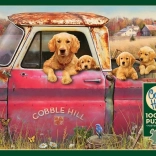 A detailed illustration of a rustic truck, flowers, and four adorable retrievers brings a warm, homey feel and joy to puzzling.