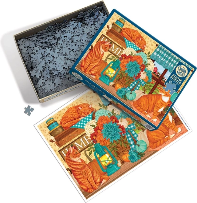 Experience the joy of relaxation with the Pumpkin-Colored Cats puzzle by COBBLE HILL. This 500-piece puzzle brings autumn ambiance to your home with a charming scene of three cats surrounded by flowers and pumpkins.