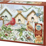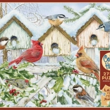Views of snow-covered birdhouses, red berries, and a variety of bird species set a calm, festive mood and motivate you to keep going piece by piece.