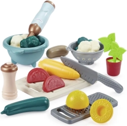 The bowl, colander, cutting board, knife, grater, and vegetable play pieces let children chop, grate, and mix just like in a real kitchen.