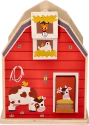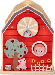 • Wooden farm: A double-sided house with illustrations of animals, trees, and a beehive provides a fun activity for children.