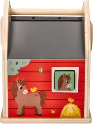 A colorful, double-sided house in the form of a stable with cute illustrations, designed as a portable toy.