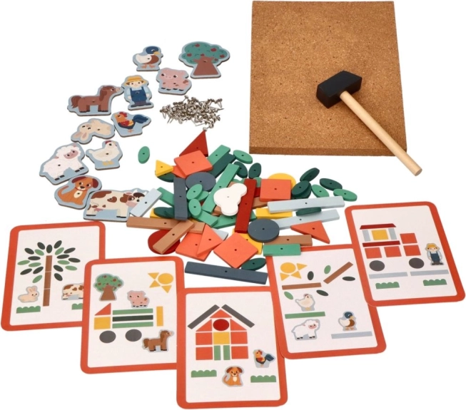 The Cork Hammering Set - Farm Adventure is an ideal way to encourage children to create their own stories. This set offers a variety of colorful wooden shapes and farm characters that can be attached to the cork board using small nails and a hammer. With the help of instruction cards, children can build different scenes and develop their spatial skills.