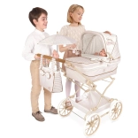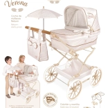 An elegant folding REBORN doll stroller from the Verona 2024 collection in natural pastel tones featuring a height-adjustable handle 65–90 cm, a lightweight folding frame, a spacious carrycot, and rich accessories including a sunshade and a stylish bag – ideal for older girls who love realistic play.