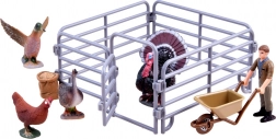 The package includes a turkey, rooster, goose, duck, farmer with wheelbarrow, feeder and fence elements, allowing kids to easily build their own mini farm and play out daily activities, feeding, and animal care.