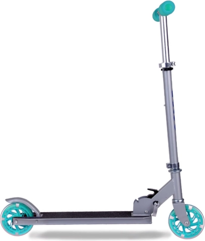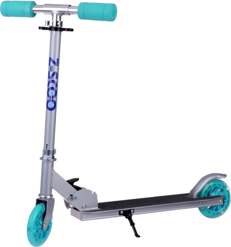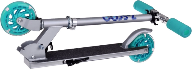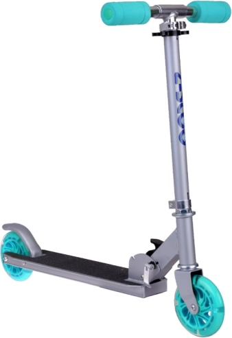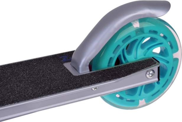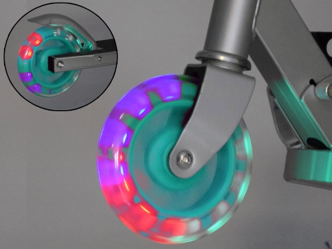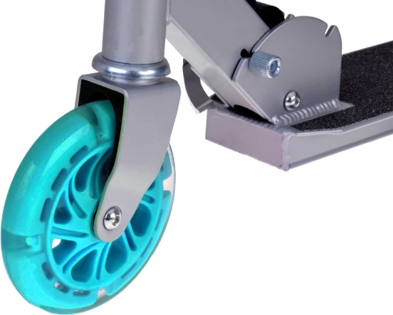 This folding kids' scooter combines low weight, a sturdy metal build, and a playful design with turquoise accents. Thanks to the LED wheels that light up while riding and require no batteries, your child is more visible and every ride is more fun.