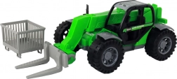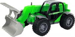 Robust green children's tractor with an extendable arm and three interchangeable attachments offers realistic play indoors and outdoors. Thanks to the friction drive, large wheels, and a transparent cab, it develops motor skills and imagination. Includes forks, a basket, and a log grab for various types of loading and transport.