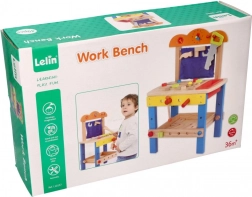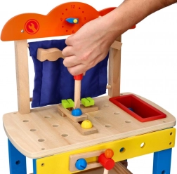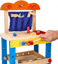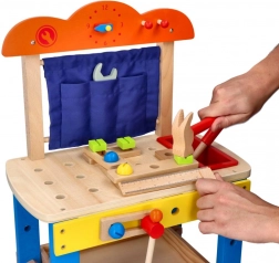 This high-quality wooden workbench is designed to safely introduce children to the world of tools. Colorful elements, functional parts like screws, nuts, and gears, and a practical tool compartment encourage natural curiosity and skill development.