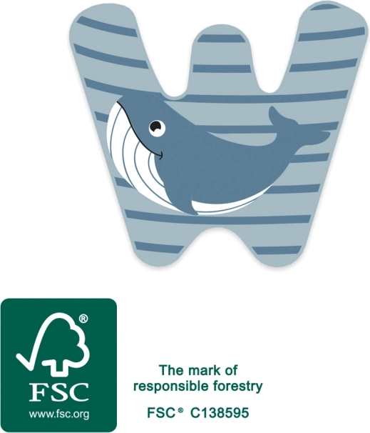 Start your journey through the alphabet with this gorgeous wooden letter W, made from 100% FSC certified wood. This product not only contributes to the sustainability of the planet but also brings a unique decorative element with cheerful pastel colors. The charming whale design stimulates children's imagination.