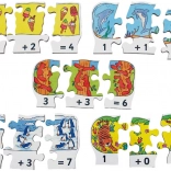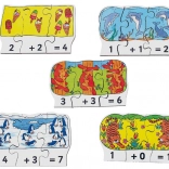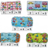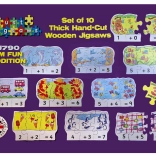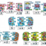 This unique set of wooden puzzles is an ideal tool for little mathematicians. Each of the 30 puzzle pieces displays images corresponding to the number on the bottom part. Children have the task of correctly matching 3 pieces to create the correct answer to a simple mathematical task. The puzzles offer: