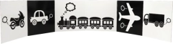 The leporelo offers visual stimulation through contrasting shapes and illustrations of transportation, which supports learning from an early age.