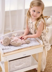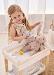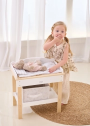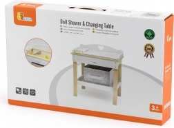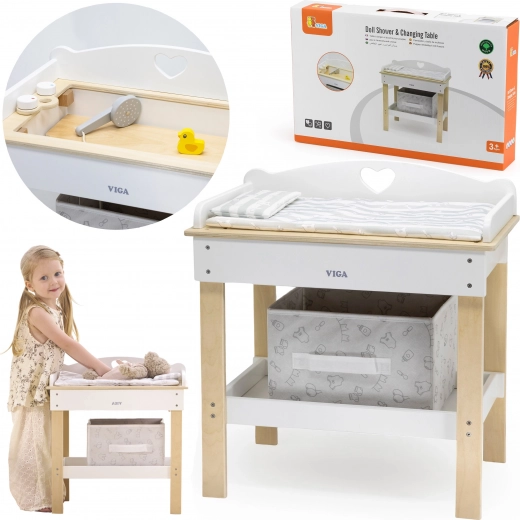 This multifunctional set by VIGA lets children realistically role‑play caring for a baby. The top panel serves as a comfortable changing station; once removed, it becomes a bathtub with a shower head for dolls’ bath time. The lower shelf with a fabric basket keeps all accessories organized and close at hand.