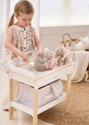 The durable wooden structure provides safe and stable play. Minimalist natural and white tones fit seamlessly into modern interiors. The set is perfect for role‑play, supporting fine motor skills, empathy, and responsibility when caring for dolls up to 43 cm.