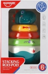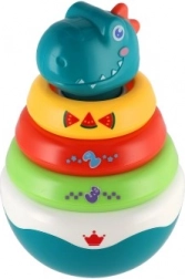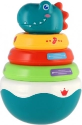 This playful stacking pyramid with a dinosaur theme combines fun and learning. The rounded base wobbles in all directions with a tap and activates a pleasant bell sound that naturally stimulates hearing. Children practice grasping, sorting rings by size, and recognizing colors — ideal for the first exploration of the world.