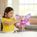 The Barbie Butterfly Ballerina doll inspires developing children's imagination with its magical 2-in-1 transformation. By pressing the necklace, her purple skirt transforms as if by magic into spread-out butterfly wings. This captivating moment can be repeated over and over. Her gorgeous look is complemented by a purple ponytail with a floral headband, pink corset, and tutu skirt. It is an ideal gift for children aged 3 and older. The doll does not stand alone. Colors and decorative elements may vary.