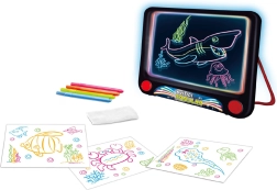 This illuminated drawing board is a great tool for young artists. It is equipped with colorful erasable markers and stencils that allow children to develop creativity while playing. The package also includes a wiping cloth, which allows you to easily start with a new creation.