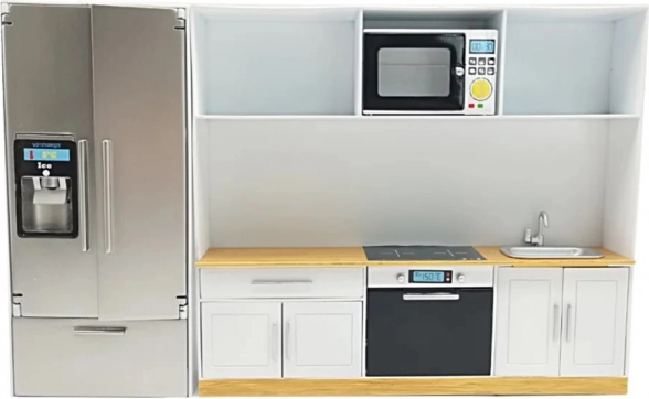 The set includes everything you need to create a fully equipped kitchen. Tiny home appliances—an oven, microwave, refrigerator, freezer, and even an ice cube maker!