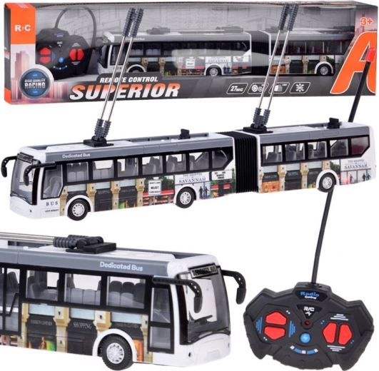 A realistic city trolleybus with articulation measuring 36 cm will delight young drivers and collectors alike. It offers remote control with forward/reverse and left/right steering, lights up with LED lights, and thanks to USB charging with the included battery, it’s ready to drive. A sturdy plastic build and detailed printing complete its attractive look.