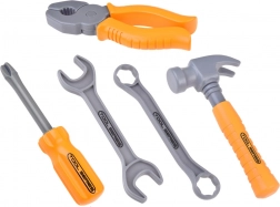 The set includes a hammer, wrenches, screwdriver, screws, nuts, and building parts—ideal for practicing fine motor skills and creative construction.