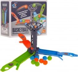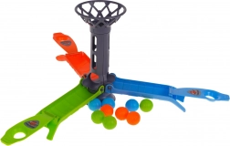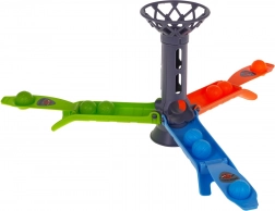 The game Who Goes First allows up to three players to compete against each other. Each player selects their station (green, blue, orange) and receives three marbles of the corresponding color. The goal is to shoot the marbles, hit the tower, and place all your marbles on the game base as quickly as possible.