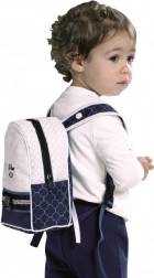 The stroller stands out with its elegant Spanish design featuring quilted details and wood-look handles. It includes a three-point safety belt, soft padding, and a spacious basket for essentials. A stylish backpack is also included, which can be attached to the stroller or worn on the back.