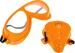 A screwdriver, hammer, wrenches, pliers, safety goggles and mask, wooden slats and fasteners. Everything for creative building and fine-motor practice.