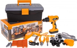 The realistic drill screws and unscrews, makes sounds, has interchangeable bits (flat, Phillips, drill bit) and a removable “battery pack”. Power: 2× AA 1.5 V (not included).