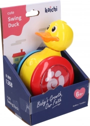 Colorful duck on wheels attracts children's attention with its rocking motion and rattling sounds of small beads.