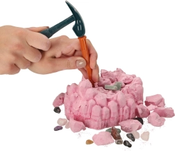 In the pink plaster block you'll find 18 real stones. Use the hammer and chisel to safely excavate them, clean them with the brush, and examine them with the magnifier.