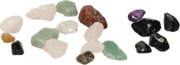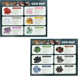 plaster block; 18 minerals; hammer; chisel; brush; magnifier; spray bottle; box/organizer for stones; display case with stand; necklace for a stone; GEM MAP information card (EN)