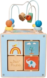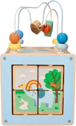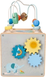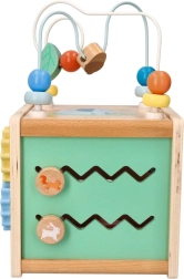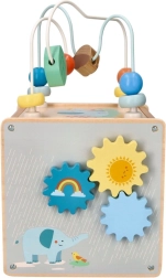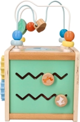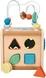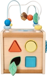 Discover a fun and educational toy for little ones: a wooden activity cube with a top bead maze, shape sorter, gears, and more activities. Supports fine motor skills, logical thinking, and hand–eye coordination. Ideal from 12 months.