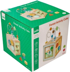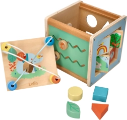 This high-quality wooden activity cube from LELIN offers children a wide range of activities on every side. Colorful beads on wires, mazes, shape sorting, and gears hold attention and naturally develop skills, creativity, and patience.