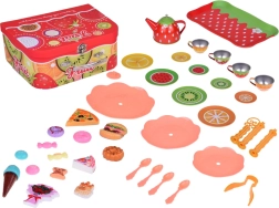 A cute children's fruit tea set in a practical suitcase brings 36 pieces for hours of fun. The metal teapot, cups, and plates are complemented by a three-tier stand and a colorful selection of toy treats for café or tea party play. The durable design and colorful fruit theme support creativity, communication, and role play.