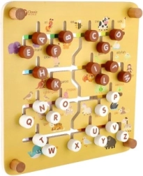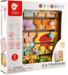 The double-sided wooden 2-in-1 labyrinth by CLASSIC WORLD combines play and learning: a farm with animals on one side, and an alphabet with animals on the other. Children practice fine motor skills, logical thinking, and concentration as they guide pegs through the maze to the correct spots. High-quality wooden design, size 30 × 30 cm, suitable from 3 years.