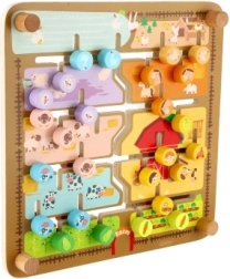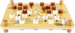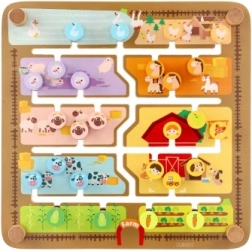 A smart and fun aid for preschoolers: the double-sided board hides two worlds. On the farm side, children move pegs with animals, faces, and fruit along carved tracks to their places. Flip the board and it becomes an alphabet maze—the task is to guide the peg with the initial letter to the correct animal (names are in English), playfully practicing letters and vocabulary.